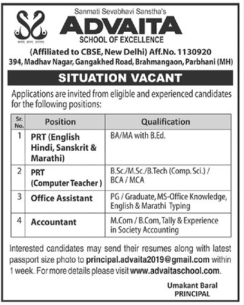 Teachers Wanted Advaita School Of Excellence Parbhani Facultyplus